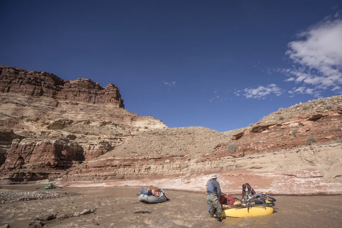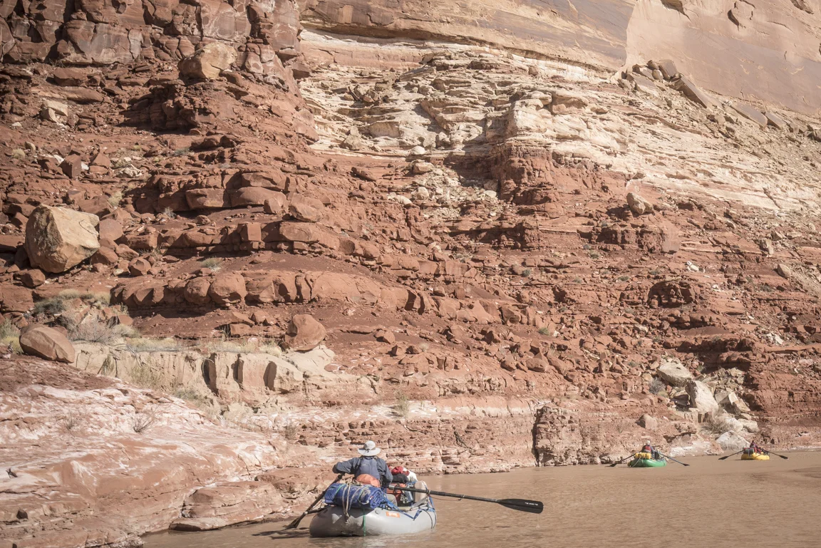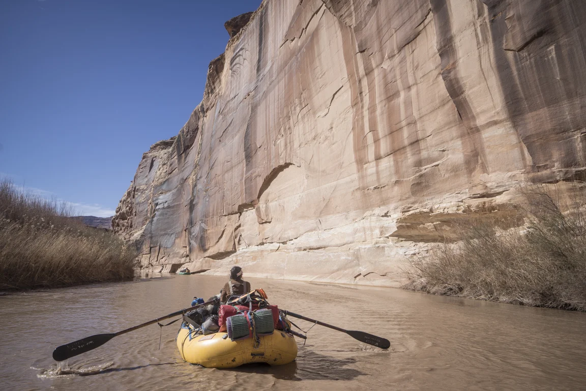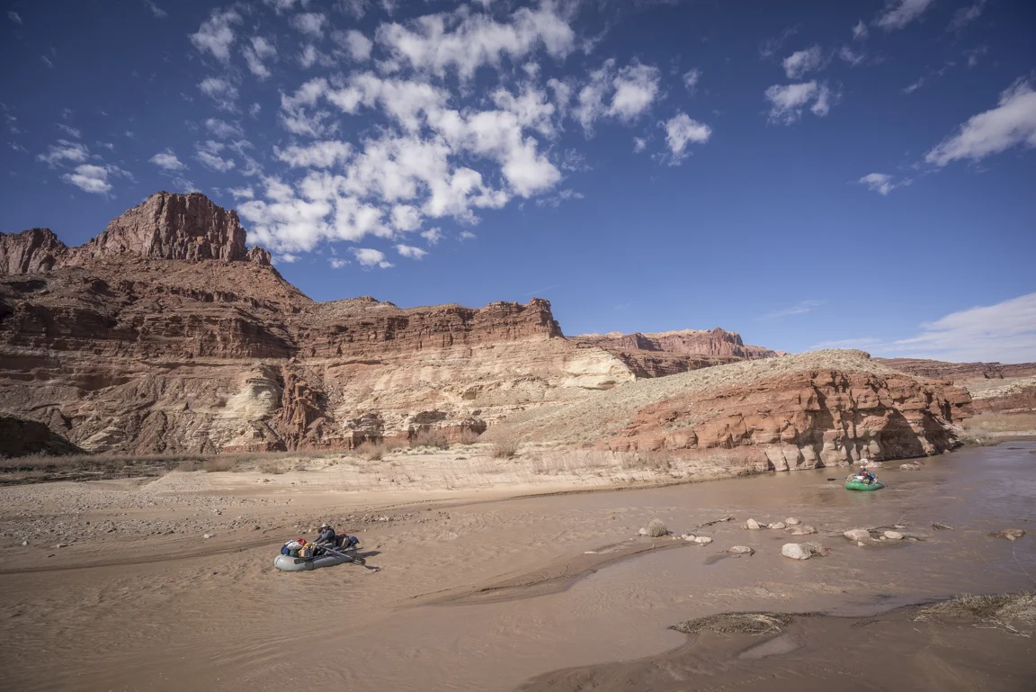 The canyon country around us continues to uplift, twisting and contorting it folds in on itself in jagged chaos replete with a vivid menagerie of golds oranges and reds. In a few spots it becomes necessary to dust the oars off in order to guide the boat around rocks sprouting up from the riverbed. To call it rowing would be generous. With each stroke the oar blade exudes a hollow thud as it comes into contact with the packed mud of the river bottom, the blade only ever being half-way submerged. Far from graceful it gets the job done.