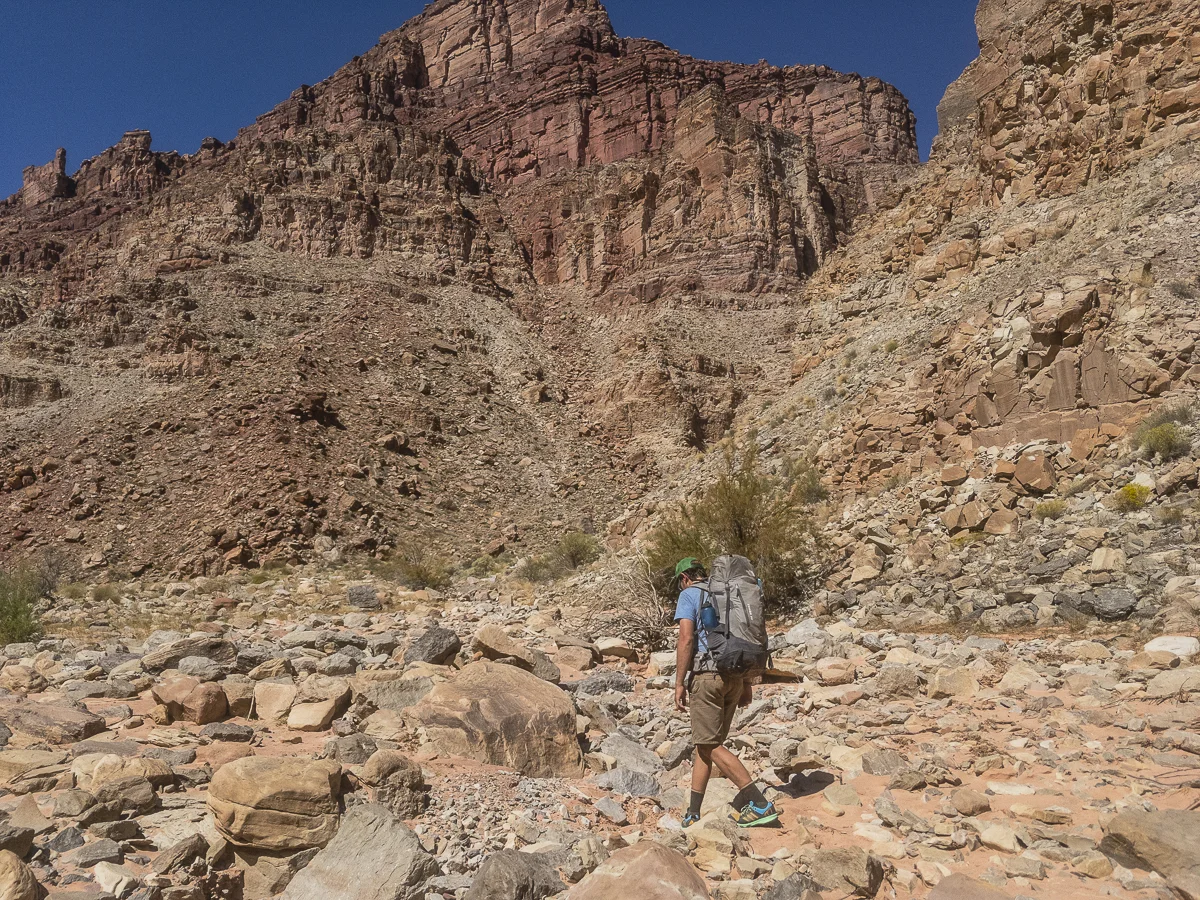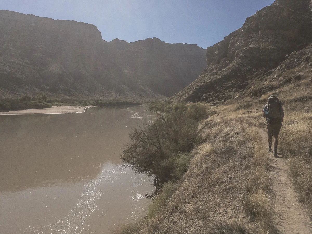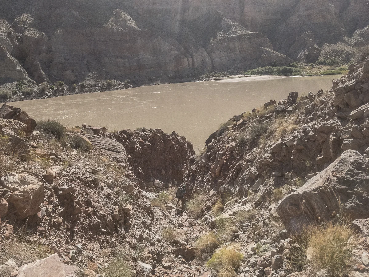 A hunch-backed posture allows one to traverse the low water bedrock cut to access a canyon wall otherwise completely obscured from the river by a dense thicket of tamarisk.