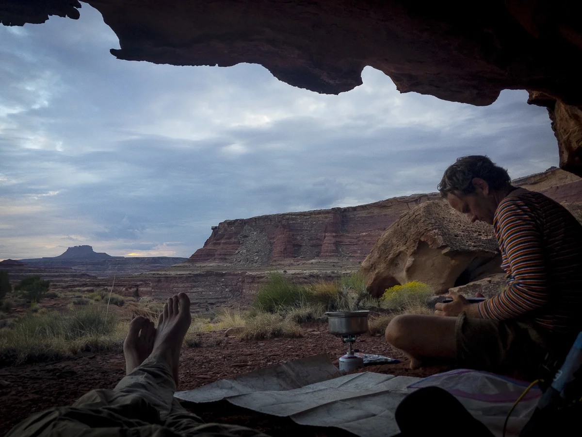 The next day we have a long slog. Navigating the entangled canyon system we head north, hoping to be within sight of the Green by evening. After a long day of walking we spy our humble exit to the canyon rim, filling up with a few gallons of water before heading out. As the clouds build we race the light as it again begins to rain - our old friend Ekker Butte disappearing in and out of thick roiling grey. Finally, in the vicinity we had hoped to reach, we find another protected camping spot and throw down sans tent.
