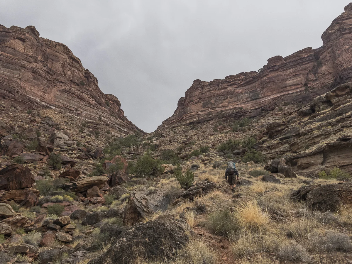 As we approach the canyons of the Maze the clouds open up and it begins to pour. We take a brief reprieve under an overhanging rock near our access point. I’ve thought about this moment at times in the ensuing years and its one that brings great happiness. Being utterly exposed but also having everything we need in them middle of a week long outing with a friend - it was just so damned good and I was happy and thankful to be out in it.